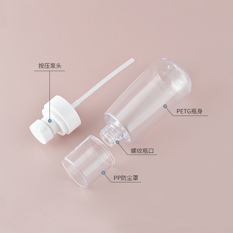Bought all the different sizes of spray bottles to see the difference. Pic shown is 100ml used to contain hydrosol as toner. Bottle is a bit rounded and curvy, minimalist design super pretty. Spray came out as mist very comfy to spray on face. Happy with purchase.
