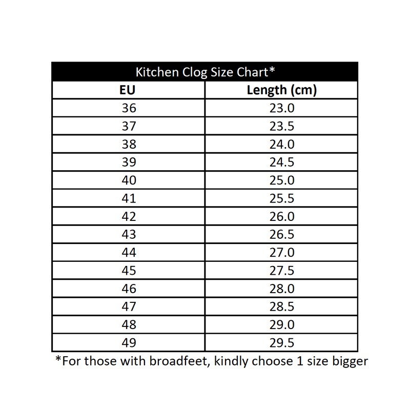Wearing Comfort:Non-slip, comfortable and spacious for feet with a broad front. Suggested Look:Goes well with an apron or pants. Suitable Occasion:In the kitchen or casual wear. Value for money. Broad front. Smooth and nice finishing.