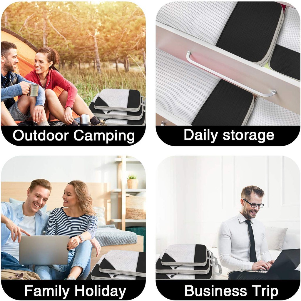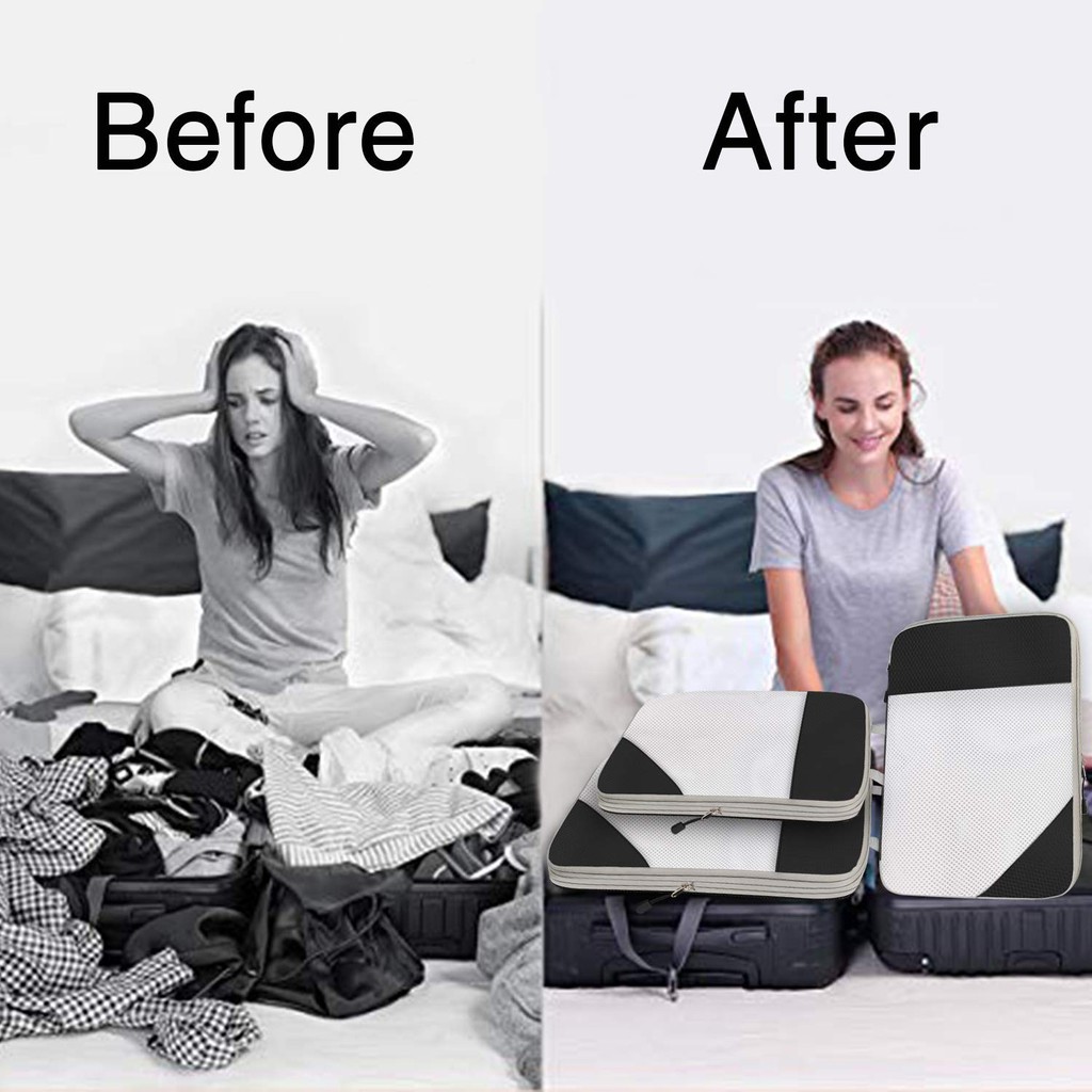 Suitability:When your luggage is too full or lacks separate compartments. Quality:Good material, zips sewn well and zips smoothly. Performance:Does help in organizing items when packing and makes clothes more compact It's good to have the 3 sizes so can pack clothes, under garments n socks, and other items separately. Second zip helps to compact a bit as can be seen in video - after unzipping main zip, you can see the difference. Look forward to using on my trip.