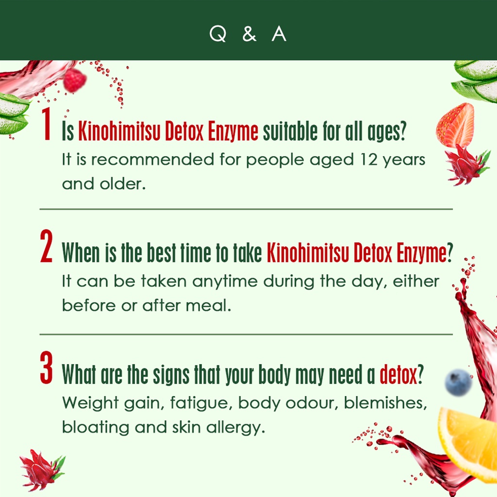 Suitability:Everyone except pregnant ladies & lactating mums. Performance:Good Package received well packed in good condition. Speedy delivery (within 3 days) and seller is always prompt & efficient. Repeated purchased here as my mum is happy with Kinohimitsu’s products. Bought this for myself and got free goodies. Really love the berry taste and helps with detoxing after my holiday feasting. Highly recommended. Thank you for the freebies!?