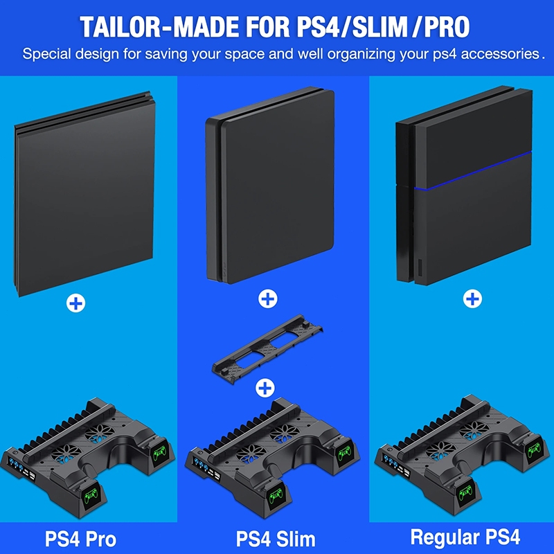 Product Quality:Excellent Best Feature(s):Saves space Value For Money:Yes The PS4 Dual Charger LED Vertical Cooling Stand is a must-have for PS4 owners. It efficiently charges two controllers simultaneously and keeps your console cool with its built-in fan. The LED indicators are convenient, and the vertical design saves space. Perfect for PS4, PS4 Pro, and PS4 Slim models.