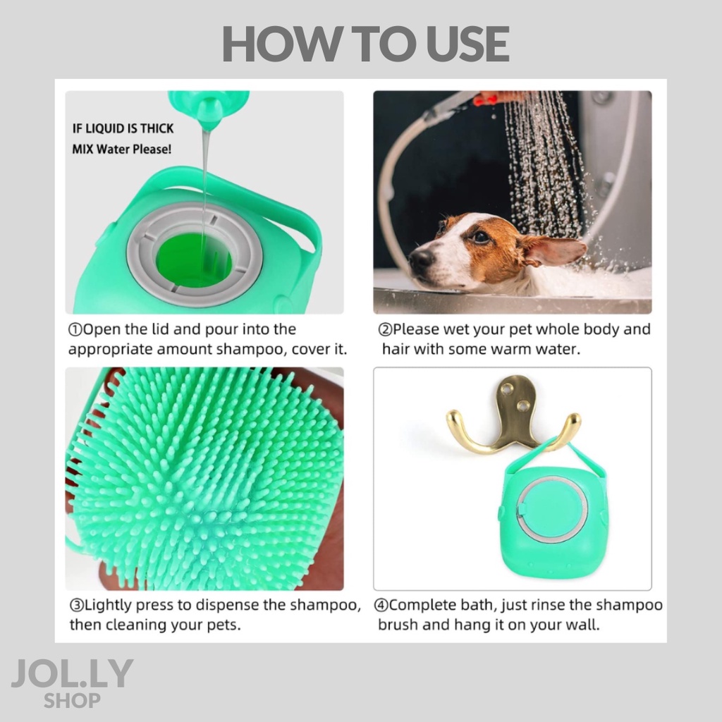 Suitability:v.gd Quality:v gd Performance:v.gd Soft brush for scrubbing! Dog enjoys a good scrub with the soft bristles. Can pour soap and wash easily on the pet.